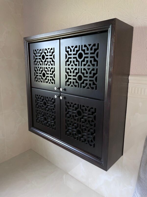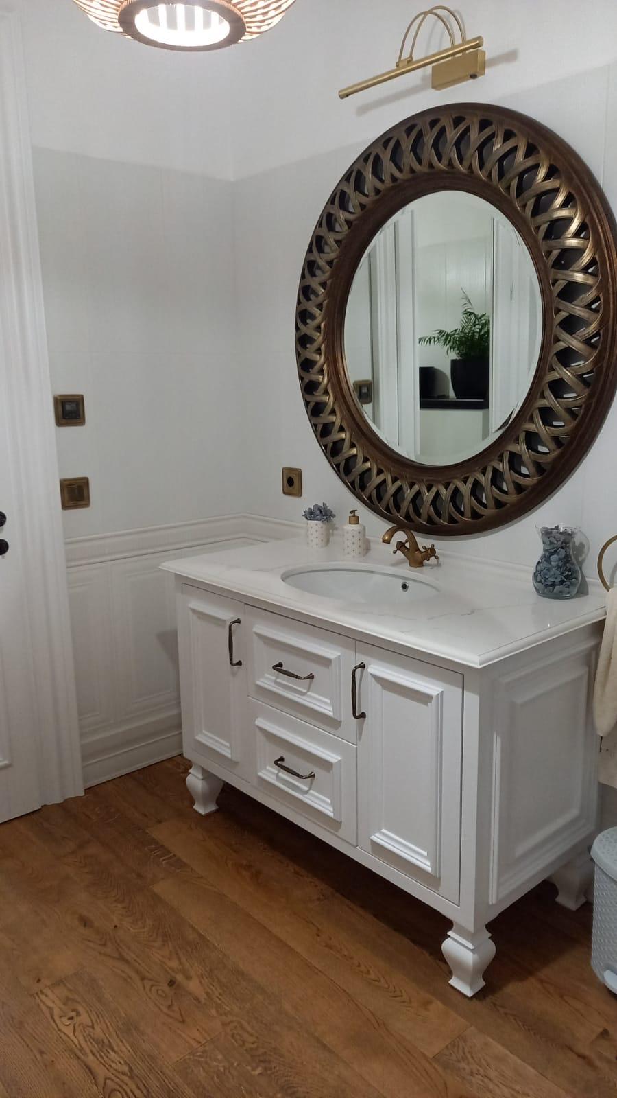 Mobilierul de baie din lemn masiv stratificat, ideal pentru spații umede. Finisajele poliuretanice și adezivii rezistenți la apă asigură un aspect luxos și funcționalitate.