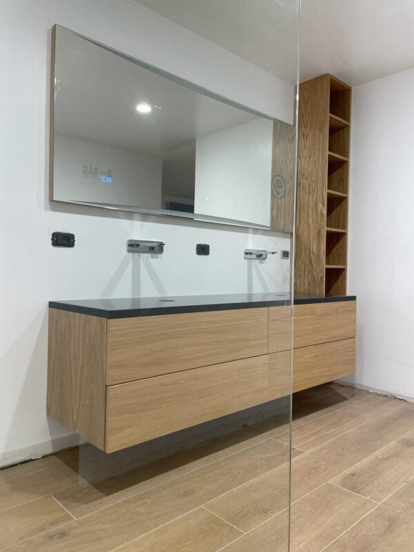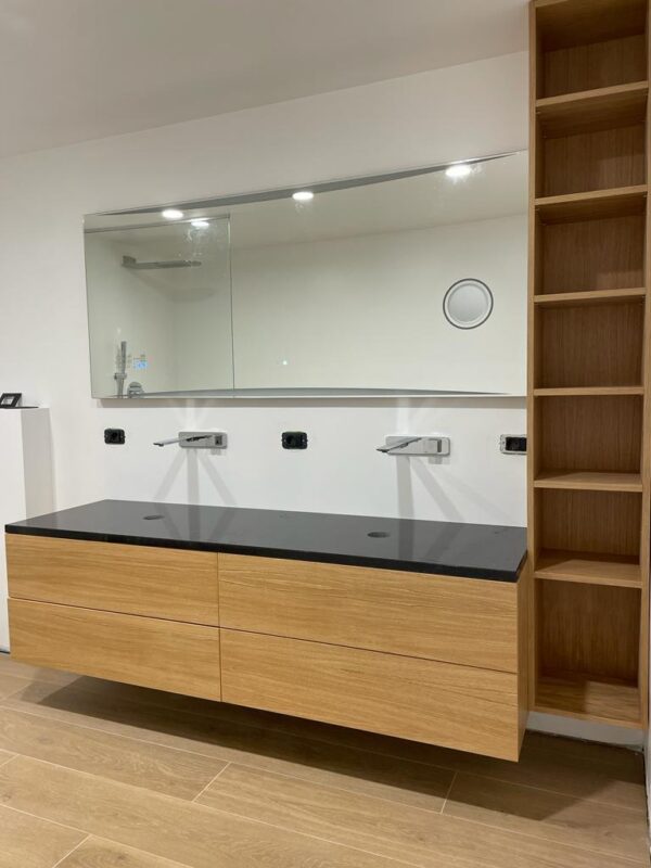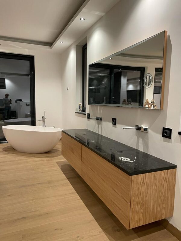 Mobilierul de baie din lemn masiv stratificat este elegant și durabil, ideal pentru spații umede. Lemnul are umiditate controlată (7-12%) și este îmbinat cu adezivi D3 sau D4, rezistenți la apă. Finisajele poliuretanice protejează lemnul și păstrează aspectul luxos. Designul sofisticat include dulapuri suspendate, lavoare încorporate și oglinzi cu iluminare integrată, combinând funcționalitatea cu estetica de lux.